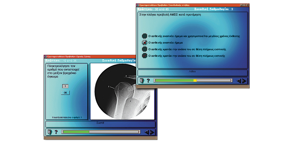 Κάθε ερωτηματολόγιο περιέχει ερωτήσεις πολλαπλής επιλογής και ερωτήσεις αναγνώρισης ανατομίας και ακτινοανατομίας με βάση εικόνες και σχεδιαγράμματα. Οι ερωτήσεις παρουσιάζονται με τυχαία σειρά ενώ γίνεται και χρήση χρονόμετρου.